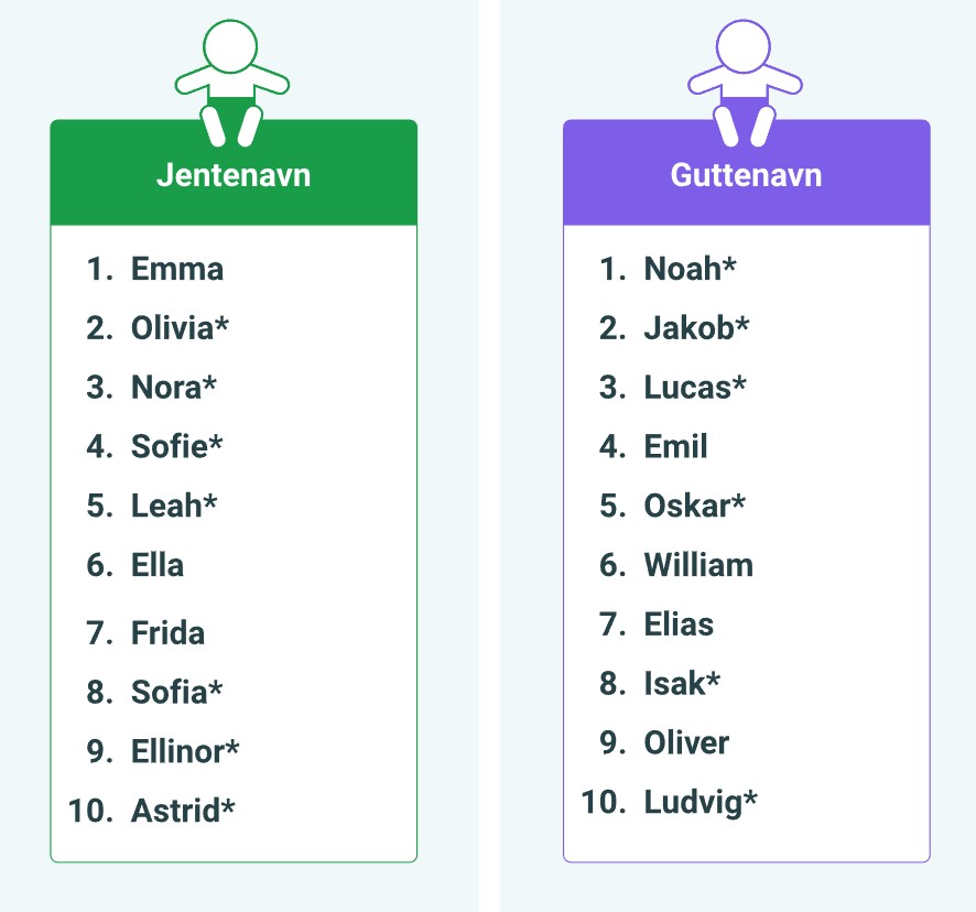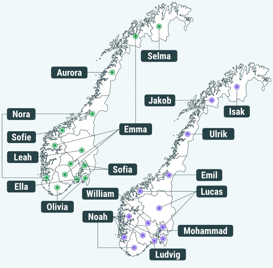 Najpopularniejsze imiona w Norwegii w 2025 roku.
