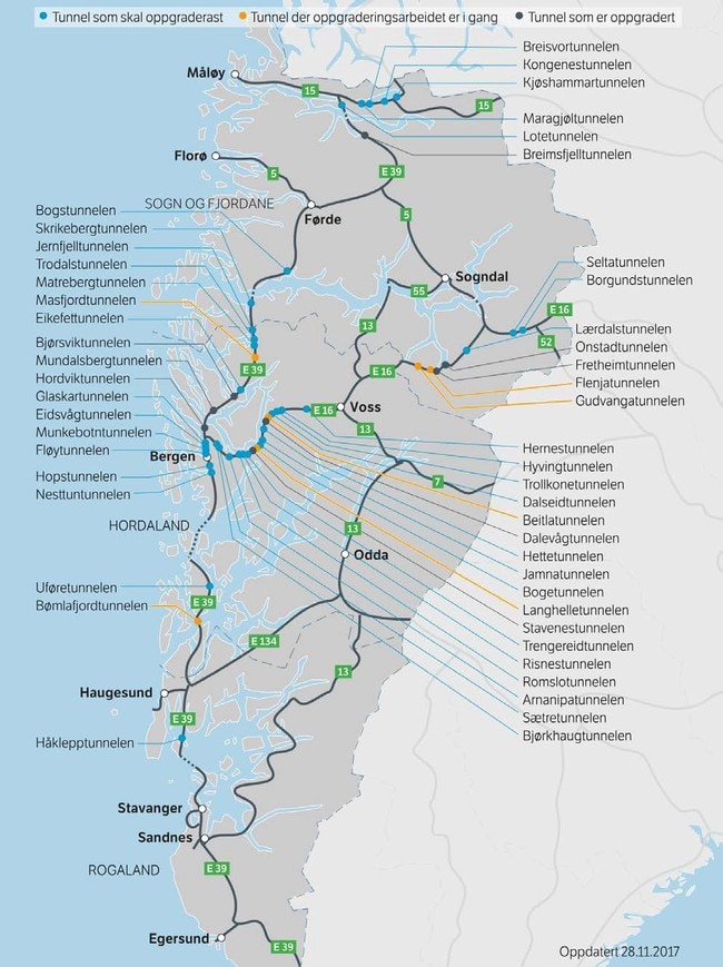 Wśród najbardziej znanych i uczęszczanych tuneli, które wkrótce doczekają się renowacji, znajdują się Masfjordtunnelen na E39, Gudvangatunnelen na E16, a także najdłuższy tunel świata – Lærdalstunnelen. Największą zmorą kierowców może się jednak okazać Fløyfjellstunnelen w Bergen. W konsekwencji jego remontu ruch będzie prowadził przez centrum miasta oraz w pobliżu słynnego nabrzeża Bryggen.
